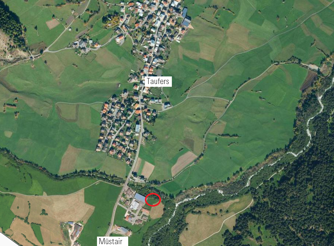 Bei der betreffenden Liegenschaft handelt es sich um ein Baugrundstück in der Handwerkerzone in Taufers im Münstertal. Das Grundstück hat eine Fläche von insgesamt 837 m², davon liegen ca. 562 m² in der Gewerbezone und ca. 275 m² im Landwirtschaftichen Grün.