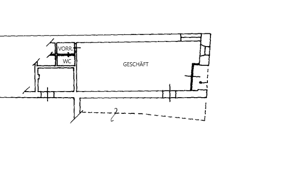 Das Geschäft liegt im Erdgeschoss und verfügt über einen Verkaufsraum, ein WC und einen kleinen Vorraum. Es hat eine Fläche von ca. 63 m².
